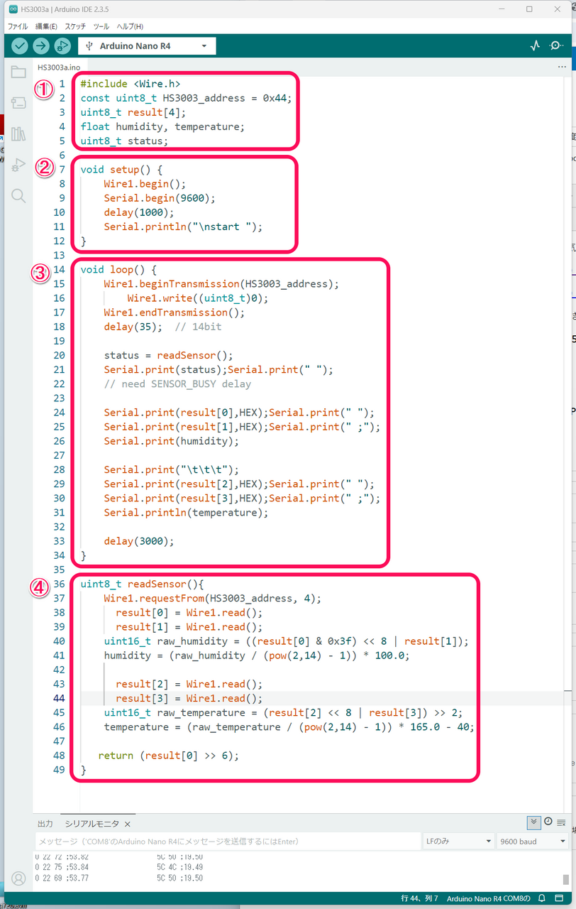 Arduino Nano R4の活用 ⑪ I2C 湿度・温度センサHS3003 のスケッチ スケッチの説明<第5回>