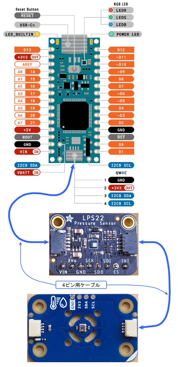 Arduino Nano R4のQWIICコネクタにつなぎます。単独でもよいのですが、ここではLPS22HBボードのコネクタにつなぎます。どちらのボードも二つのコネクタを搭載しています。