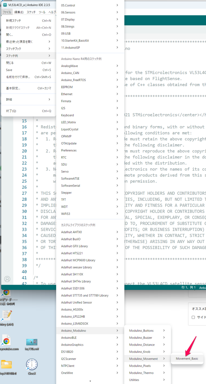 サンプル例は、Modulino_MovementのMovement_Basicを選びます。