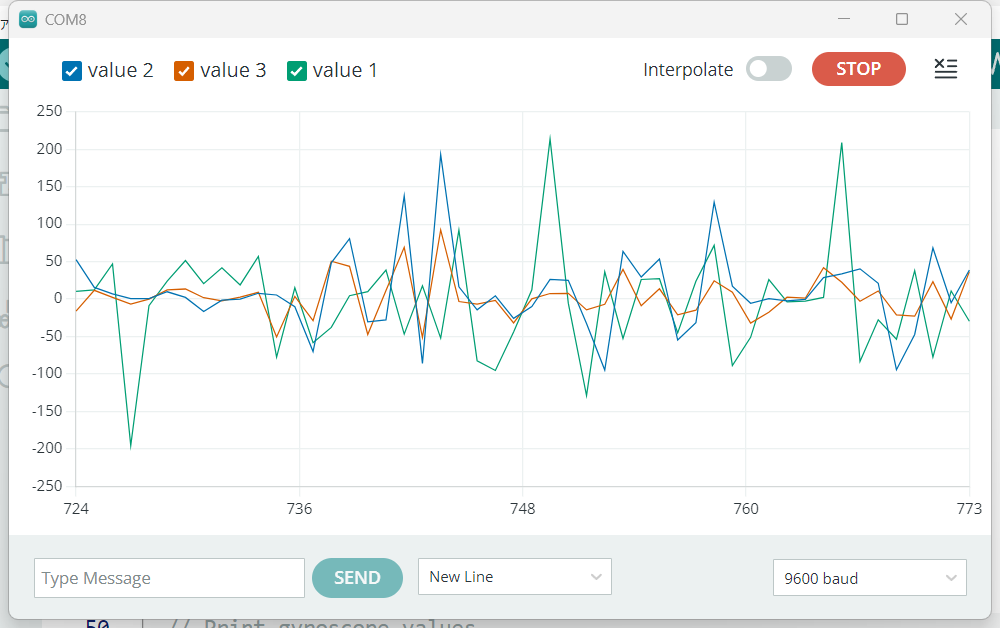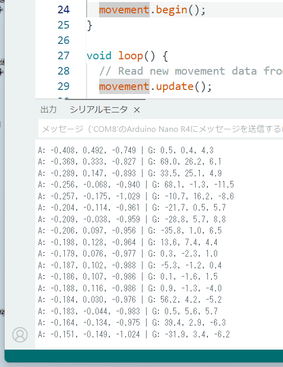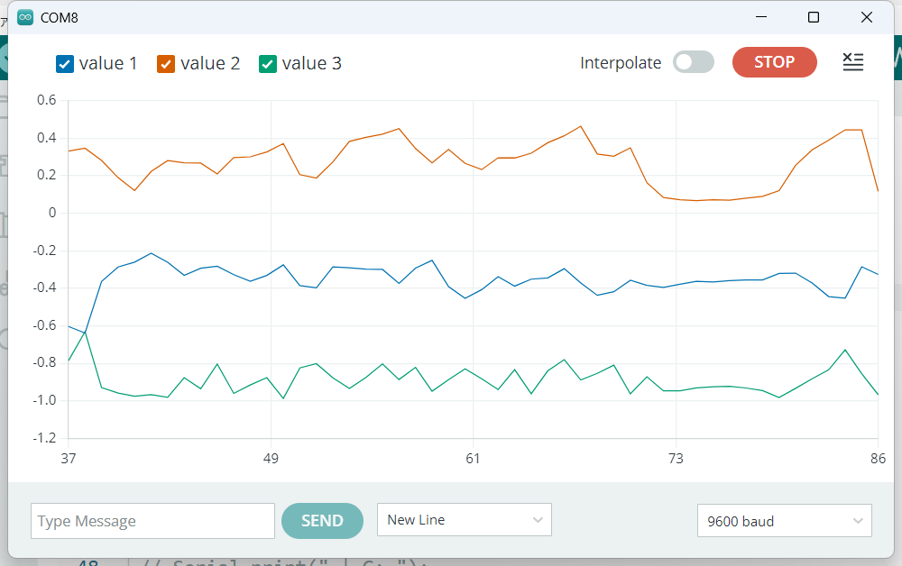 Movement_Basic.inoを実行すると、シリアルプロッタに表示が出ません。二つのセンサの一つだけを生かすように変更します。