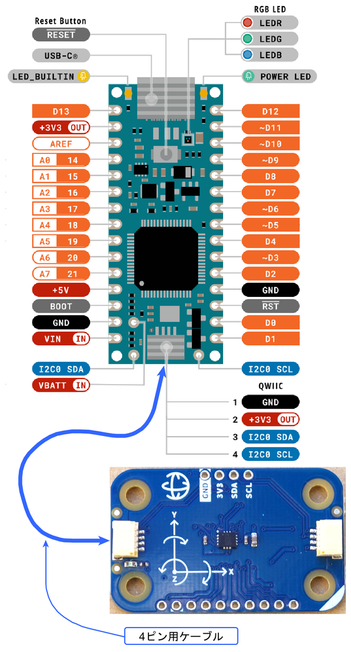 Arduino Nano R4のQWIICコネクタにつなぎます。
