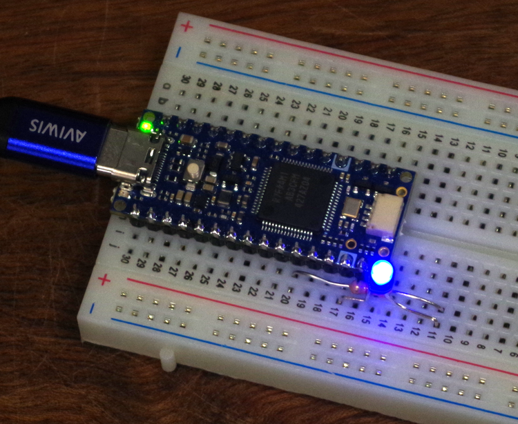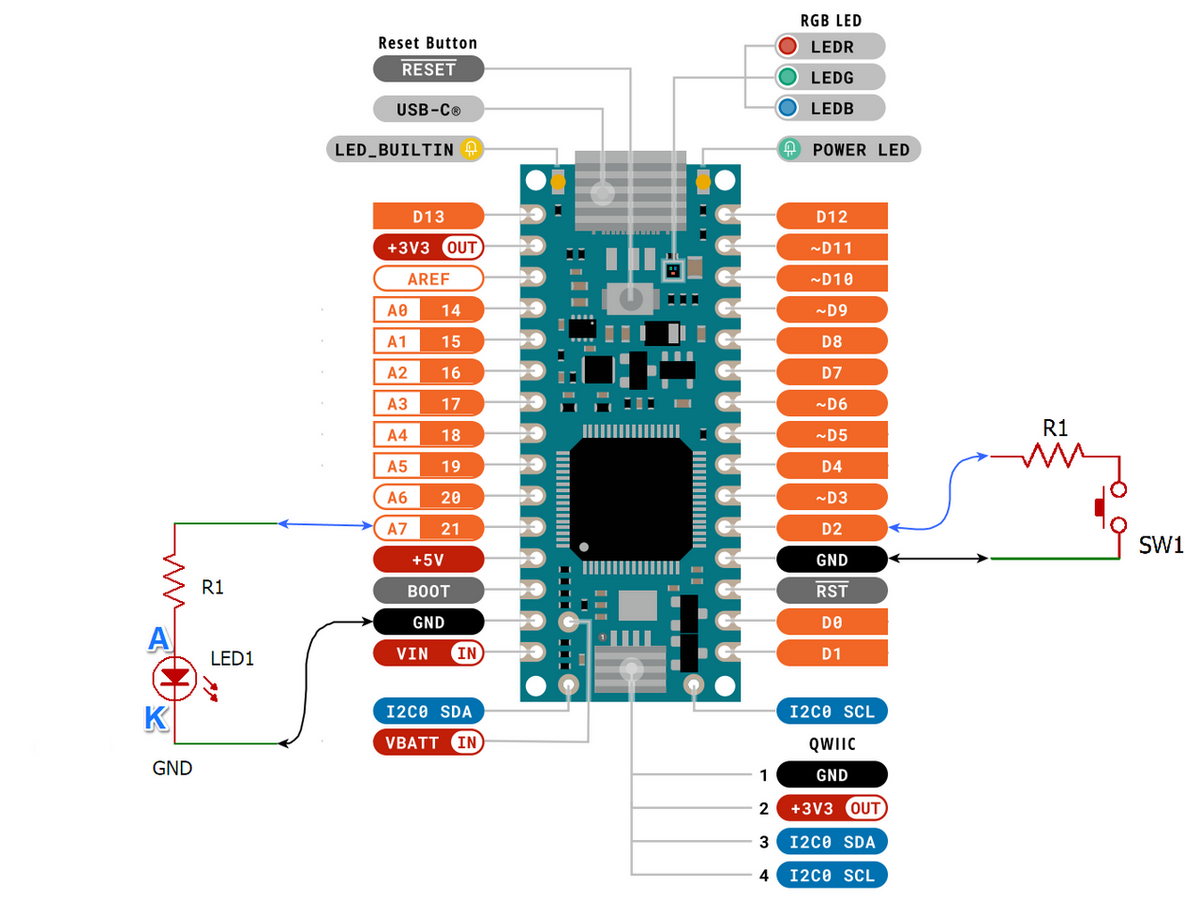 青色LEDはA7端子につながっています。スイッチはD2端子につなぎました。スイッチをD2端子に直接つないでいますが、できたら、R1に100Ω程度を直列に入れておいたほうが安全かもしれません。100Ωはなくても動作に影響はありません。