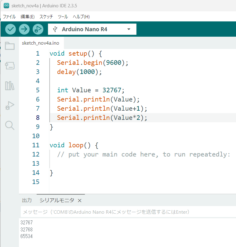Arduino Nano R4で、+32767を超えるとどうなるか確かめます。2バイト以上の大きな数値が扱えることが確認できました。
