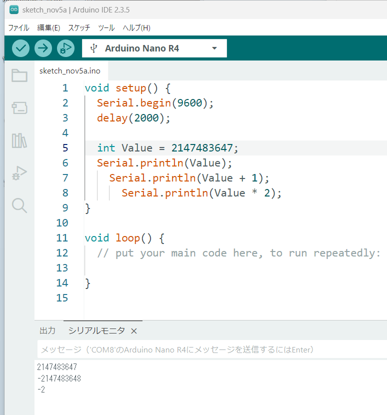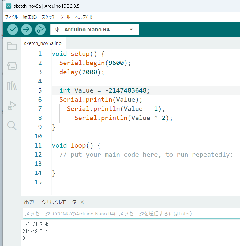 Arduino Nano R4で、int32_t(4 バイトの符号付き整数); -2,147,483,648 ~ 2,147,483,647を超えるとどうなるか確かめます。4バイト数値まで扱えることが確認できました。