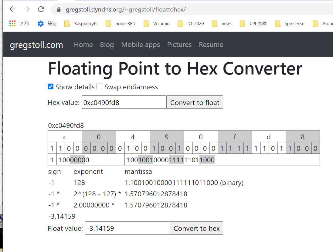 Floating Point to Hex Converterのサイトに行って確認します。