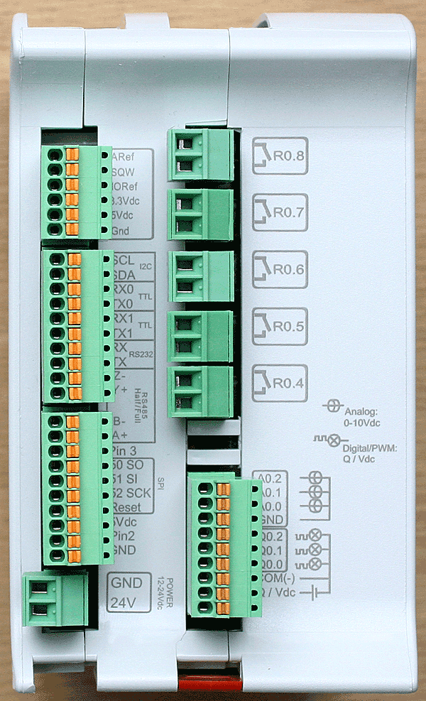 本体はDINレールに取り付けられ、電源は12~24V(24V-700mA)に対応しています。PCとはUSBケーブルでつないでプログラミングします。マイコン・ボードはArduino Mega2560が使われており、I2Cを通してI/Oを拡張できます。19Rはこのシリーズの中では一番I/Oの少ないモデルです。