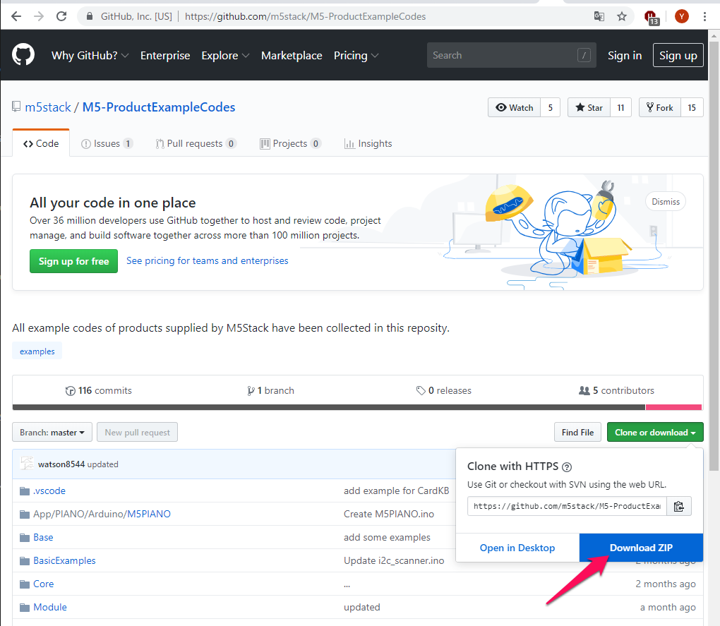 https://github.com/m5stack/M5-ProductExampleCodesからソースをZIPファイルでダウンロードします。