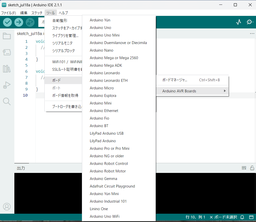 Arduino IDE2のインストール直後に、利用できるボードを確認します。そのためにメニューバーの、