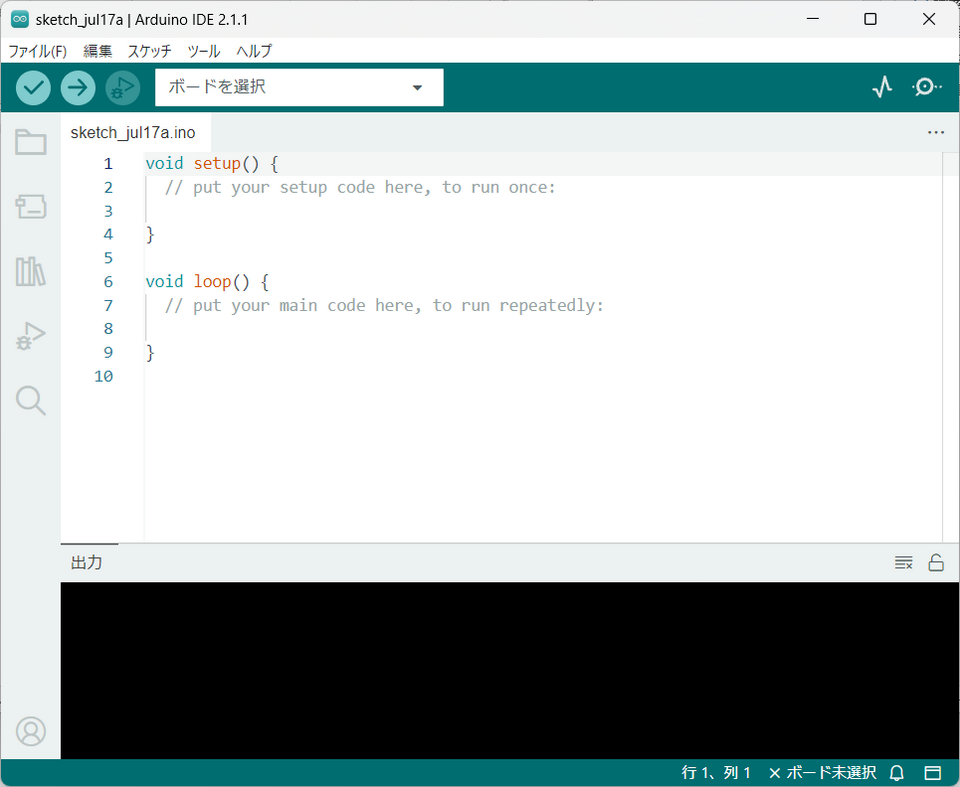 「Arduino IDEを実行」の欄をチェックしたまま「完了ボタン」をクリックすると、次に示すようにインストールしたArduino IDEが起動します。いくつかのモジュールがインストールされる様子が、画面下の「Output」で示される出力コンソールに表示されます。