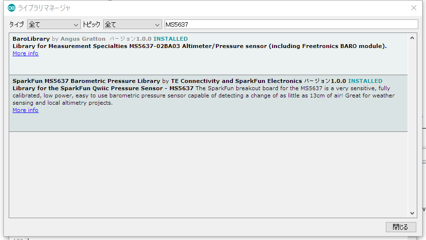 MS5637で検索すると二つ見つかります。BaroLibraryを入れました。