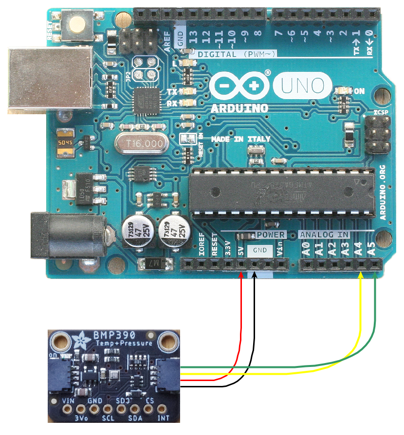 ボードには、5V->3.3Vのレギュレータと3.3<->5V信号レベル変換回路が入っています。BMP390は3.3Vで動作させますが、Arduino UNOでは5Vの電源を利用します。信号のHighレベルは5Vです。