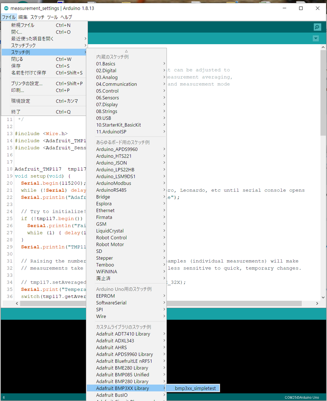 メニューのファイルからサンプルの入っているスケッチ例を選択します。そこから、Adafruit BMEXXX Library - bmp3_simpletestを選択します。デフォルトでI2Cバスを使うように記述されています。スレーブ・アドレスは0x77です。ボードの裏面のaddrをショートして0x76に設定したときは、begin_I2C()の引数に0x76を記述します。