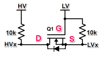 | MOSFETのON時に大電流が流れれば、寄生ダイオードは無視され、オン抵抗だけの世界になる。しかし、レベル変換回路では電流がほとんど流れない。そのため寄生ダイオードの順方向電圧Vdsfが効いてくる。なので、Arduino UNO側が5Vではなく4Vぐらいになる。BSS138 だとVdsfは0.8Vくらい。 |