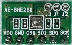 温度、湿度、気圧を測れるセンサBME280の電源は3.3Vです。I/Oも3.3Vです。インターフェースはI2CもしくはSPIのどちらかが利用できます。ここではI2Cで通信します。このモジュール「BME280使用 温湿度・気圧センサモジュールキット」は、秋月電子通商から入手しました。