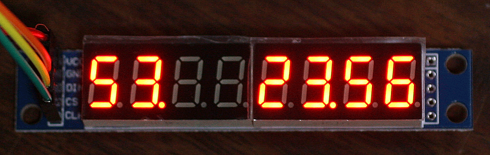 問題なく温度と湿度を表示できたので、8桁の7セグメントLEDに、湿度、温度を表示しました。読み出した湿度と温度を文字列に直します。ドットの前後で文字列を分離し、ドットを除いて合成します。7セグメントLEDではドットは文字列とは別に表示するからです。