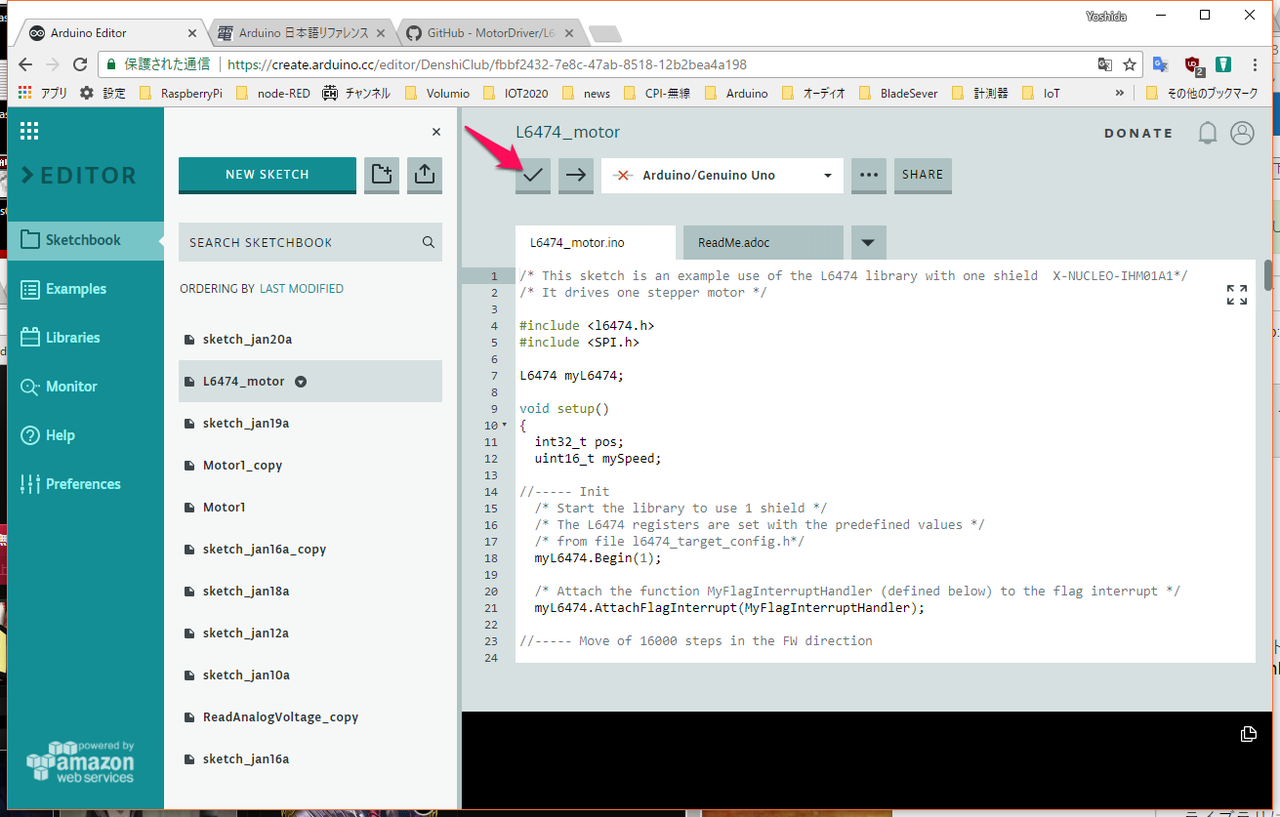 ⑥ダウンロードしたL6474-master.zipをダブルクリックし、その中にあるL6474SketchFor1MotorShieldフォルダのL6474SketchFor1MotorShield.inoを開き、全選択して、コピーし、スケッチL6474_motorの中に貼り込む。