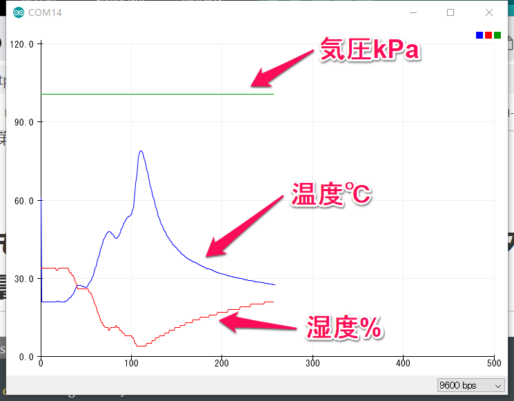 Arduino IDEでは、シリアルモニタに測定結果を出力できます。ビジュアルに表示ができるシリアルプロッタは、メインメニューのツールから選択します。スケールなどは自動なので、温度と気圧のスケールが大きく異なり、見やすいグラフにはなっていません。湿度が上がっているところは、センサを指先で触っているときです。