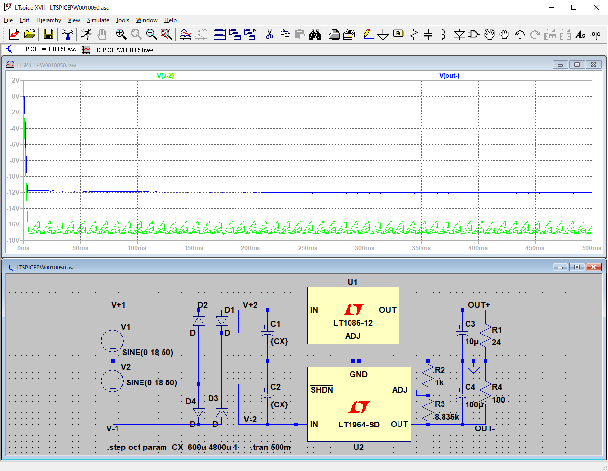 初心者のためのLTspice 入門 AC電源から直流電源を作る(5)レギュレータICを利用して±の安定化電源を作る