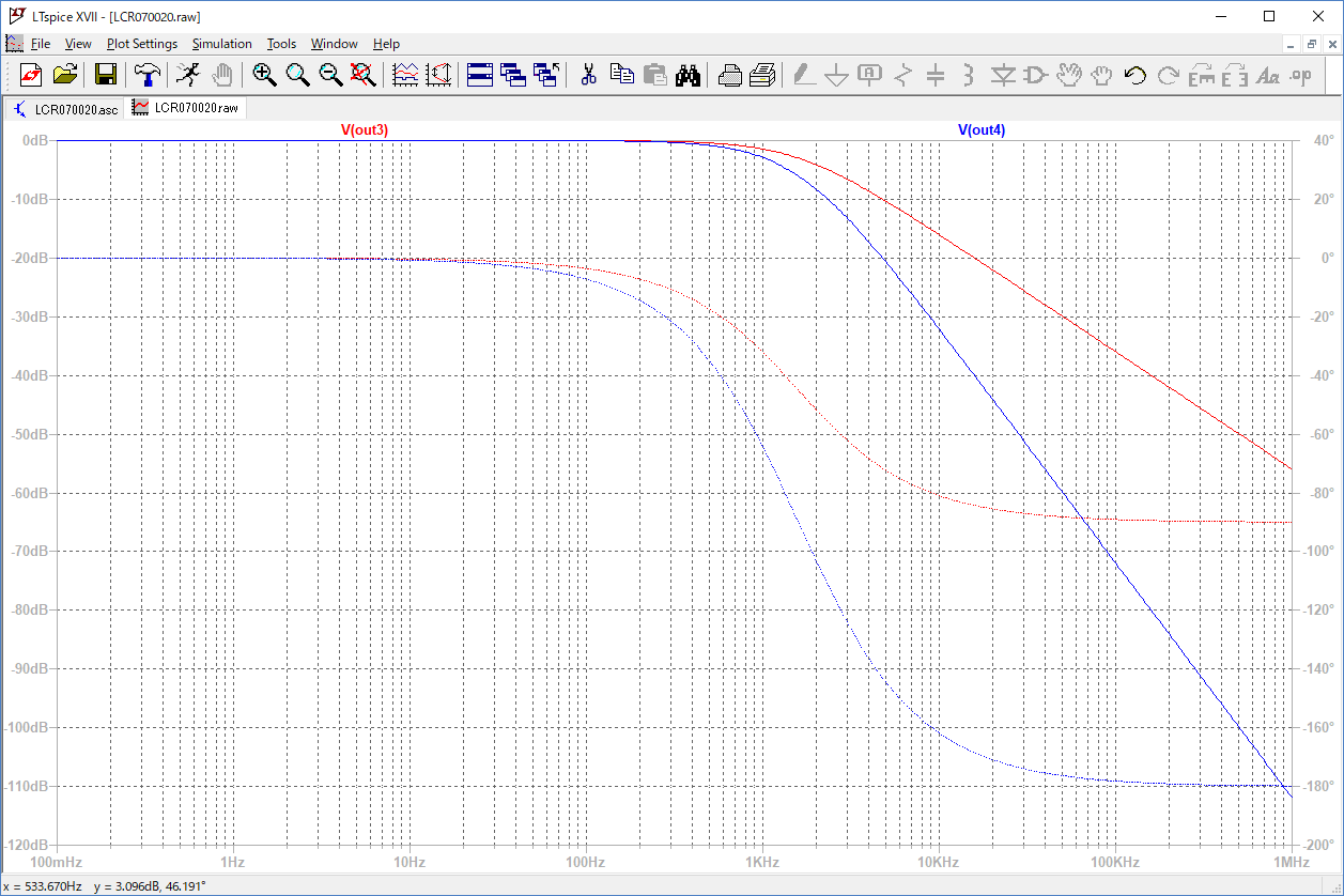 次に、波形グラフを全画面表示します。out1、out3はオクターブ当たり6dBの減少でout2、out4はフィルタが2段になっているので倍のオクターブ当たり12dBの減少となっています。位相を見ると、out1、out3は100kHz以上になると90°シフトされています。out2、out4は倍の180°のシフトになります。