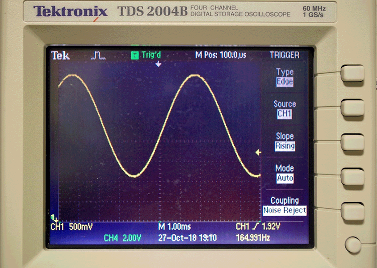 電源を投入して出力をオシロスコープで確認すると、次に示すように発振波形が確認できます。