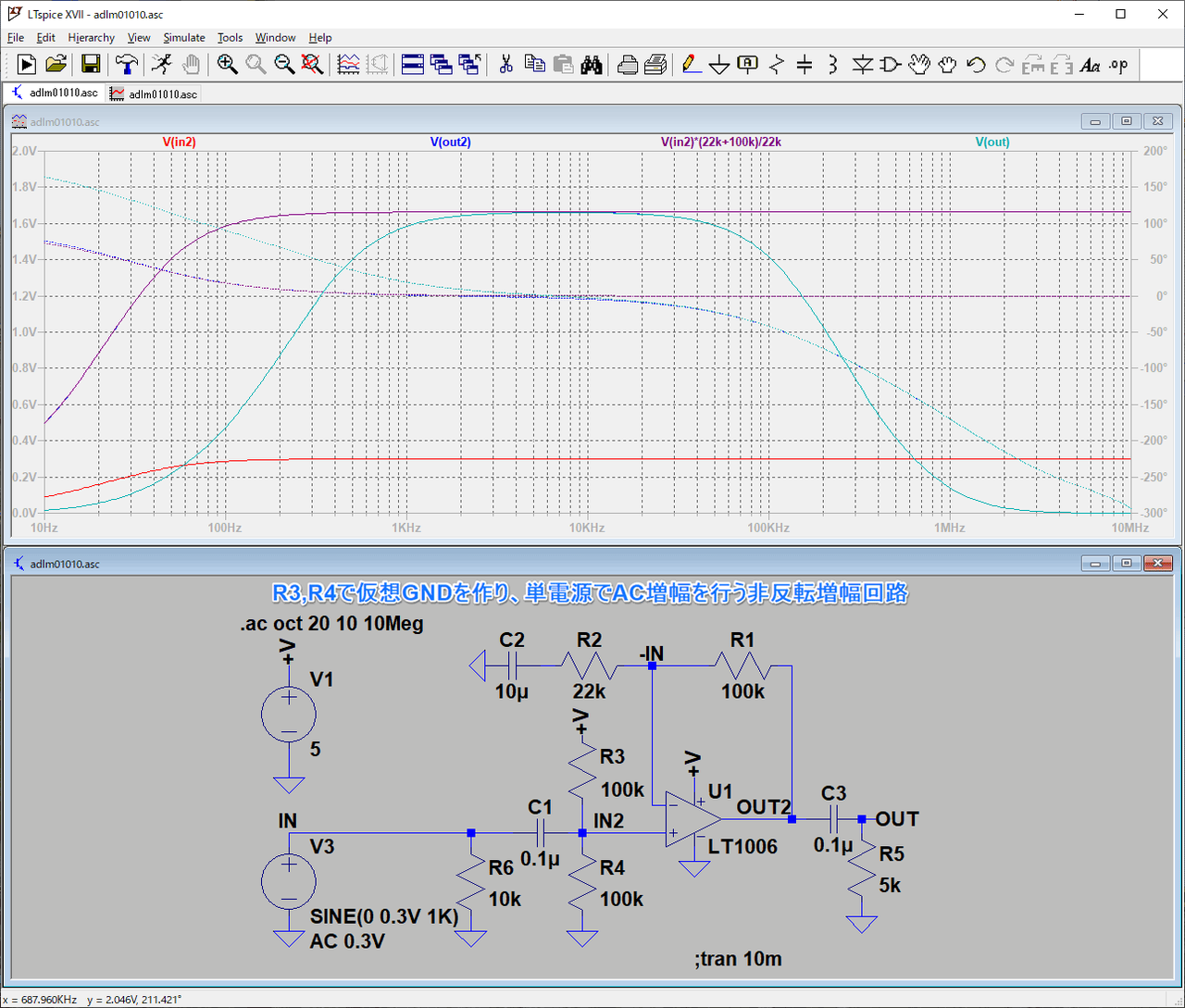V(IN)の波形は、緑色の波形で0Vを中心に、±0.3Vのピークの正弦波となっています。この波形がC1を通過して青色の波形V(IN2)になります。2.5Vを中心に±0.3Vのピークの正弦波となります。