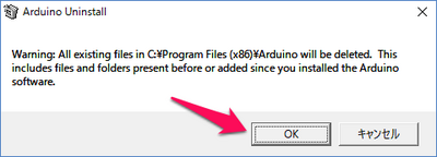 旧Arduinoのすべてのファイルが削除されるとの警告が表示されます。OKで答えて、アンイストールを進めます。