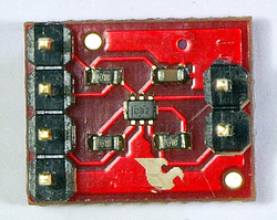 TMP102はテキサスインスツルメンツ社から発売されている温度センサで、パッケージは2mm角以下の超小型SOT563というパッケージです。手作業ではんだ付けしなくてもよいように、Sparkfunから、次に示すように10×12mmの基板に搭載し2.54mmピッチのピンヘッダを取り付けられようにしたモジュールが発売されています。