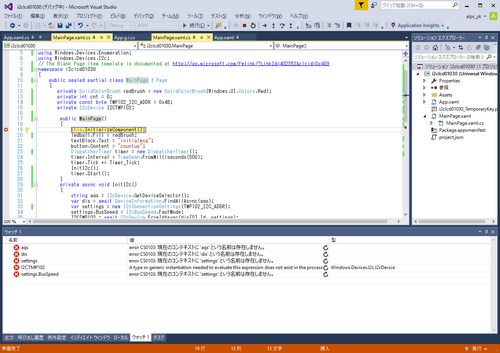 DeviceInformation.FindAllAsync(aqs)とI2cDevice.FromIdAsync(dis[0].Id, settings)は、非同期的に処理が行われます。そのために、それぞれの命令の前に非同期的な処理を指定するawaitが記述されています。また非同期処理を行う関数であることを示すために、関数名の前にasyncを記述します。