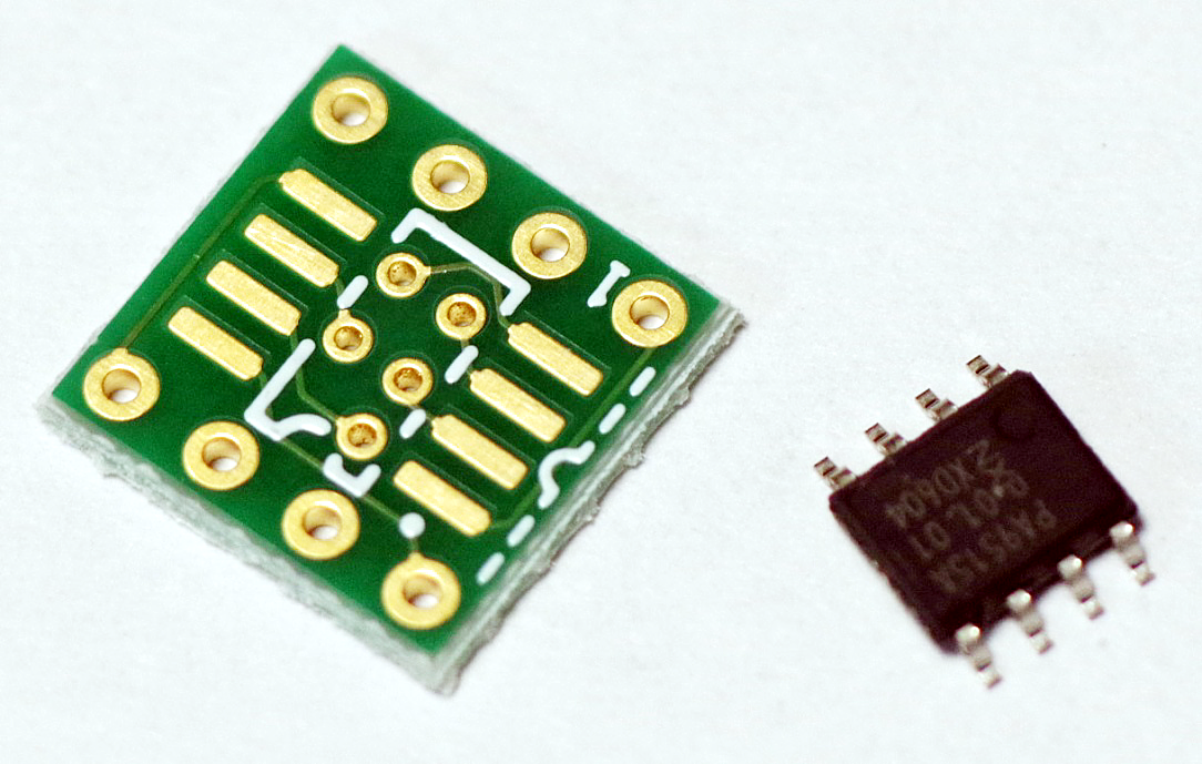 PCA9515AD、DIP化、丸ピンIC連結ソケットを用意して、ブレッドボードでPCA9515ADを利用できるようにします。このICのピン間は通常のICの半分と狭く、はんだ付けに少し気合を入れる必要がありますが、慣れるとあまり苦になりません。