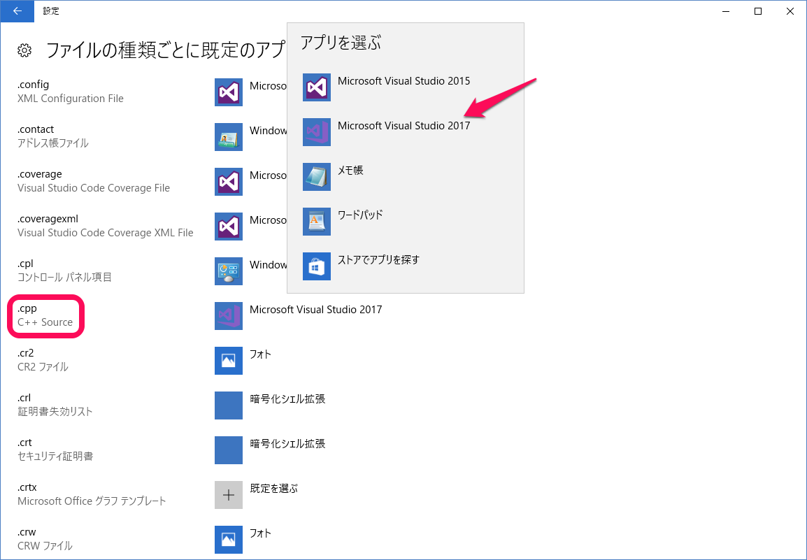 .hファイルと.cppファイルの既定のファイルをVisual Studio2017にしました。それぞれ使いやすいものを既定のアプリとしてください。