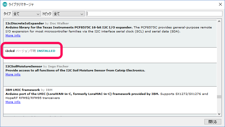を選択してライブラリマネージャを起動しi2clcdの有無を確認し、次に示すように、インストールされていることを確認しました。