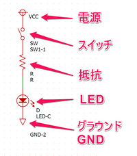 暗黙の了解というのは、電源部分です。回路図では、回路で使う電源はVCCとGNDと書かれていて、実際に結線されていません。この回路では電源は1系統しかないので、電源につないだ配線図も複雑ではありません。通常の回路は2系統、3系統の電源を使うので、それを回路図のなかに全部結線して描くと、すごく見づらくなります。