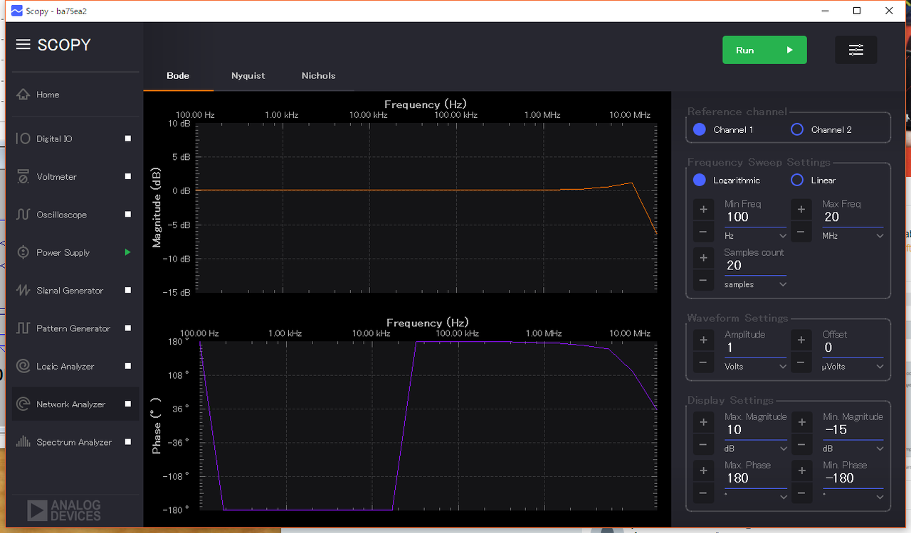 差動出力のD-Aコンバータ出力を直接接続するために差動入力になっています。このままではADALM2000のネットワーク・アナライザが使えません。もし、Scopyのプログラムを変更して、発振器の出力を二つ使い、片方の位相を180°ずらすようにすれば測定はできます。