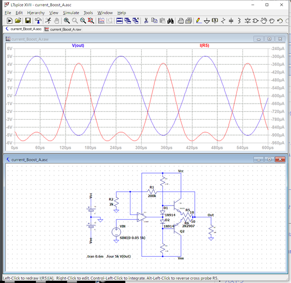 「ひずみの小さい電流ブースタ・アンプはどっち?」のWebページの最後のほうにあるLTspice040.zipをダウンロードします。解凍して出てきたファイルから、current_Boost_A.ascをクリックしてLTspiceを立ち上げます。