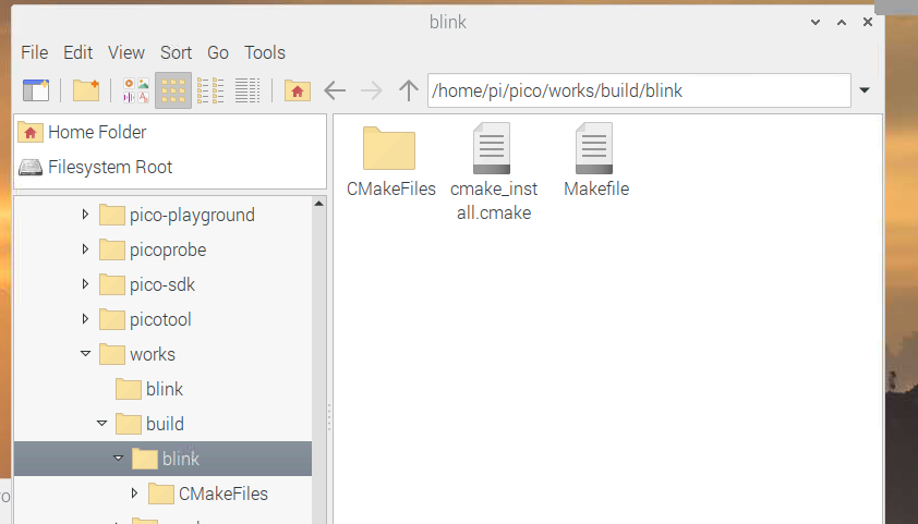Lチカから始めます。すでにソースはpico/pico-examples/blinkにあります。入っているのは、