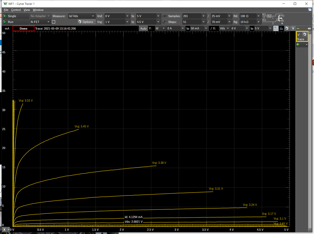もう一つの測定結果が、Id/Vdsです。ゲート電圧が4Vを超えると、ゲートに電圧をかけた瞬間に大きな電流が流れます。