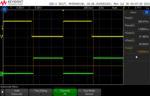 A(波形上の黄色)の立ち上がりとB(波形下の緑色)の立ち下がりは一致しています。