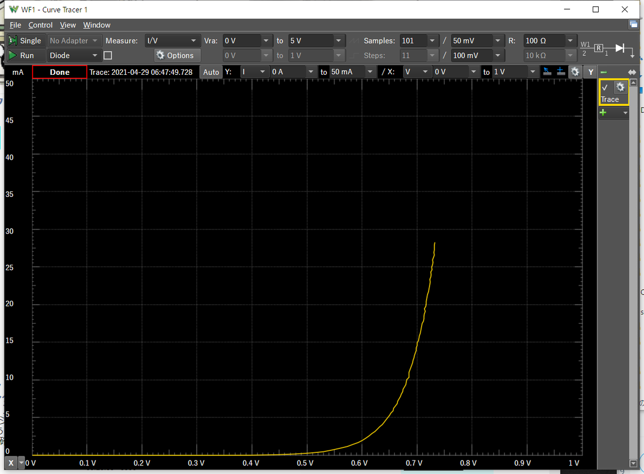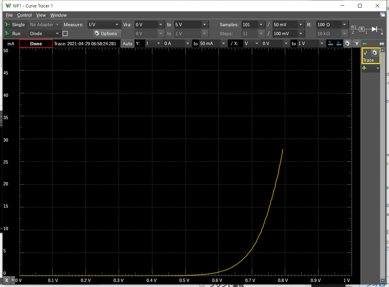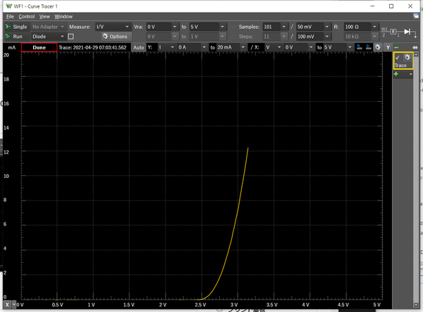USBマルチ測定器Analog DiscoveryのソフトWaveFormsに、Curve Tracerの機能が追加されています。この機能を使ってダイオードの特性を測ります。
