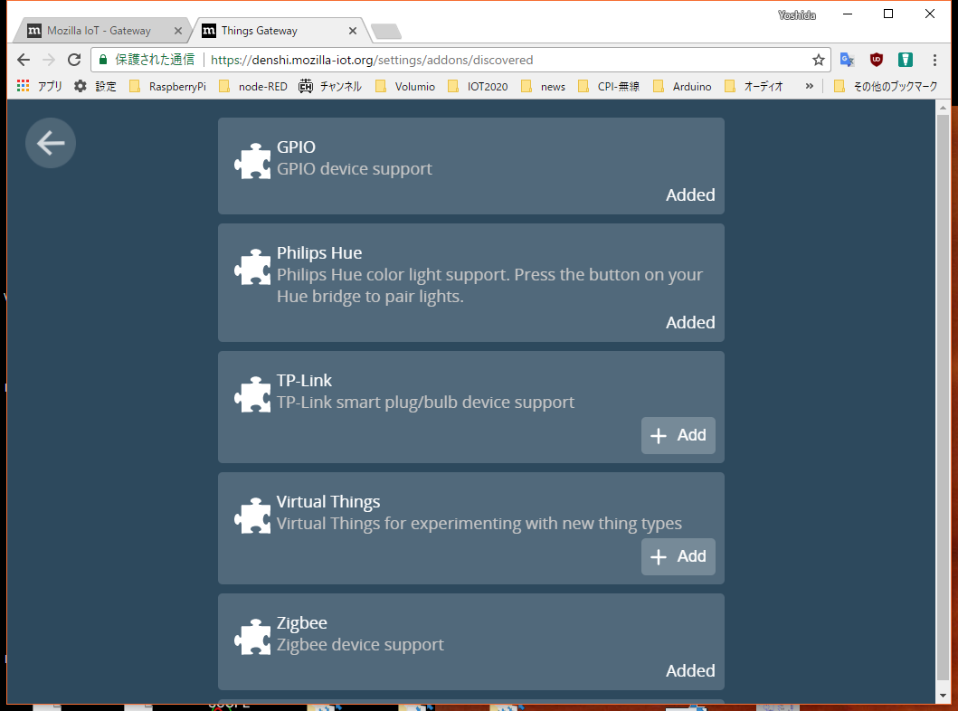 バージョン0.3で利用可能なのはこの2種類と思われます。Mozillaでは、IoTデバイスをThingsと呼びます。ゲートウェイだけでなく、将来クラウド側のソリューションも出てくる予定です。