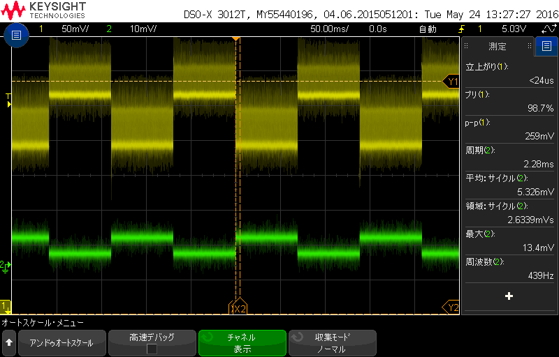 500mA時の波形です。ケーブルはAを使っています。電圧の縦軸は100mV/divです。