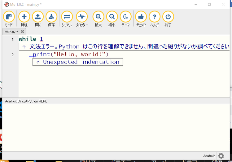 While 1: の:を忘れたと仮定します。「チェック」ボタンをクリックすると、文法チェックと、Pythonのコーディング・ルールからの逸脱を指摘してくれます(この画面では何も指摘されていない)。