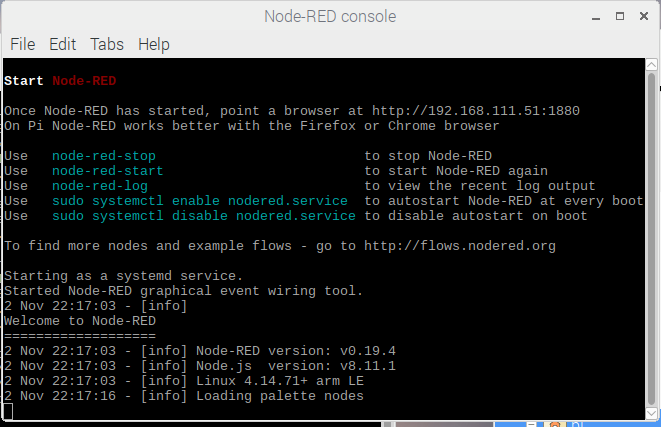 20分ほどで最新版になります。このアップデートをしておかないと、Node-REDの一部のメニューが出てこず、利用上不便です。