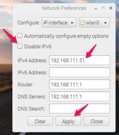 DHCPサーバのリースIPアドレスを外れた固定IPアドレスとしたい値とゲートウェイ(Router)、DNSサーバのアドレス(今のルータはDNSを中継してくれる)を入れ、Disable IPv6にチェックを入れます。Applyをクリックし、Closeをクリックします。