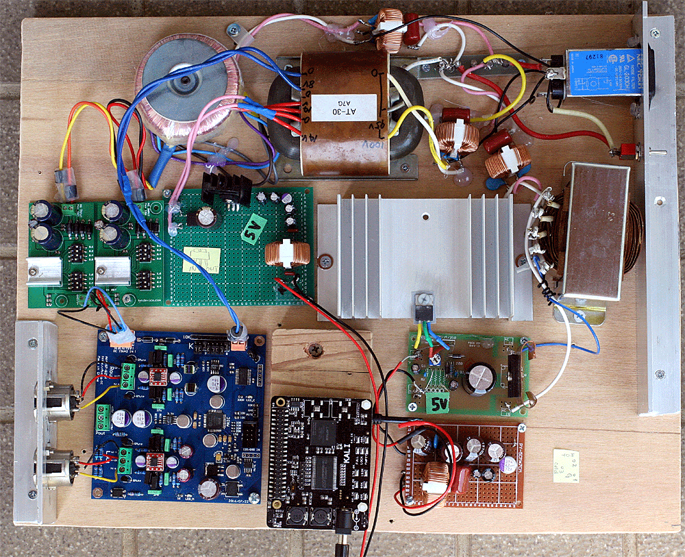 電源は、手持ちのトランスを3個使いました。それぞれの1次側にはファインメット・コアを使ったコモン・モード・フィルタを入れました。ラズパイ・ゼロの電源は可変3端子レギュレータLM338Tを使い、出力には容量の異なるコンデンサを並列につなぎました。トランスはEIコアの3Aです。リクロッカKALIの5Vは3端子レギュレータで作りました。AK4497EQ用AC 8V電源は同じトランスを使いました。Rコア・トランスです。±15Vはebayで購入したロー・ノイズLDO TPS7A4700電源基板を使いました。トランスはトロイダル・コアです。