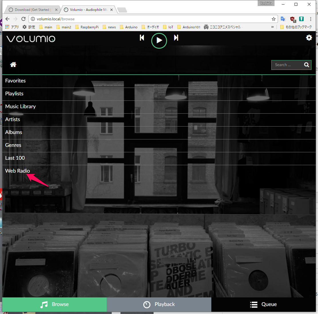 PCのWebブラウザを立ち上げて、URLに http://volumio.local/ と入力します。この表現のアドレスで探してくるには、avahi(Linux)、bonjour(AppleのiTunes)、mDNS(Windows 10など)のいずれかが動いていることが前提です。iPadやmacOSマシンでは大丈夫です。WindowsでiTunesを一度でもインストールしていたら、大丈夫です。Linuxも多くはavahiが動いています。