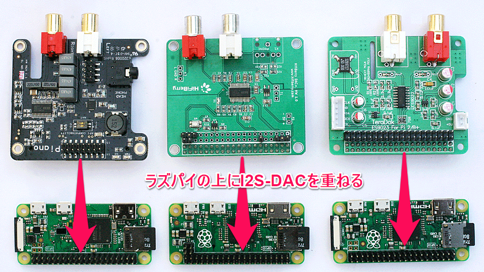 正しくGPIOに挿し込むだけで配線は完了です。ずれたり、正反対に挿し込めるので、慎重に重ねます。写真は、左からpiano、Hifiberry、TeraDakです。pianoはVolumio shop、Hifiberryは直接、TeraDrkはebayから購入しました。