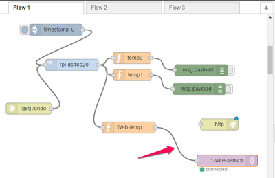 前回、functionノードに、次のjavascriptを記入しました。1-Wireの温度センサ2個の測定データをメッセージに加えます。前回、httpで利用したのと同じです。