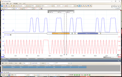 SCLの波形がすごくなまっています。この後400kHzにすると、3.3Vまで波形が伸びません。垂直軸を19ビットと高精度にして表示をしているため、USBオシロスコープの演算速度が足りなくなったようです。