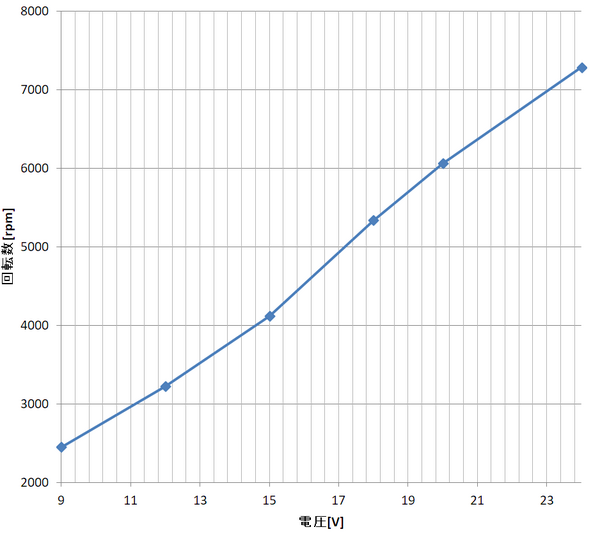 いろいろなモータのカタログを見ると、XXrpm/Vという表現が見つかります。今までの実験では約13Vの実験用電源をつないでいました。最初に、モータの電源電圧を変化させて回転数を測ります。モータ42BLF01のデータシートには、24Vdcで4000±300rpmと書かれています。