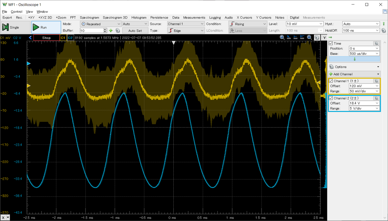 FFTです。下の黄色が入力で、青色が出力です。次の事例でよくわかるのですが、出力が入力波形を歪ませ、2次の高調波が観測されています。